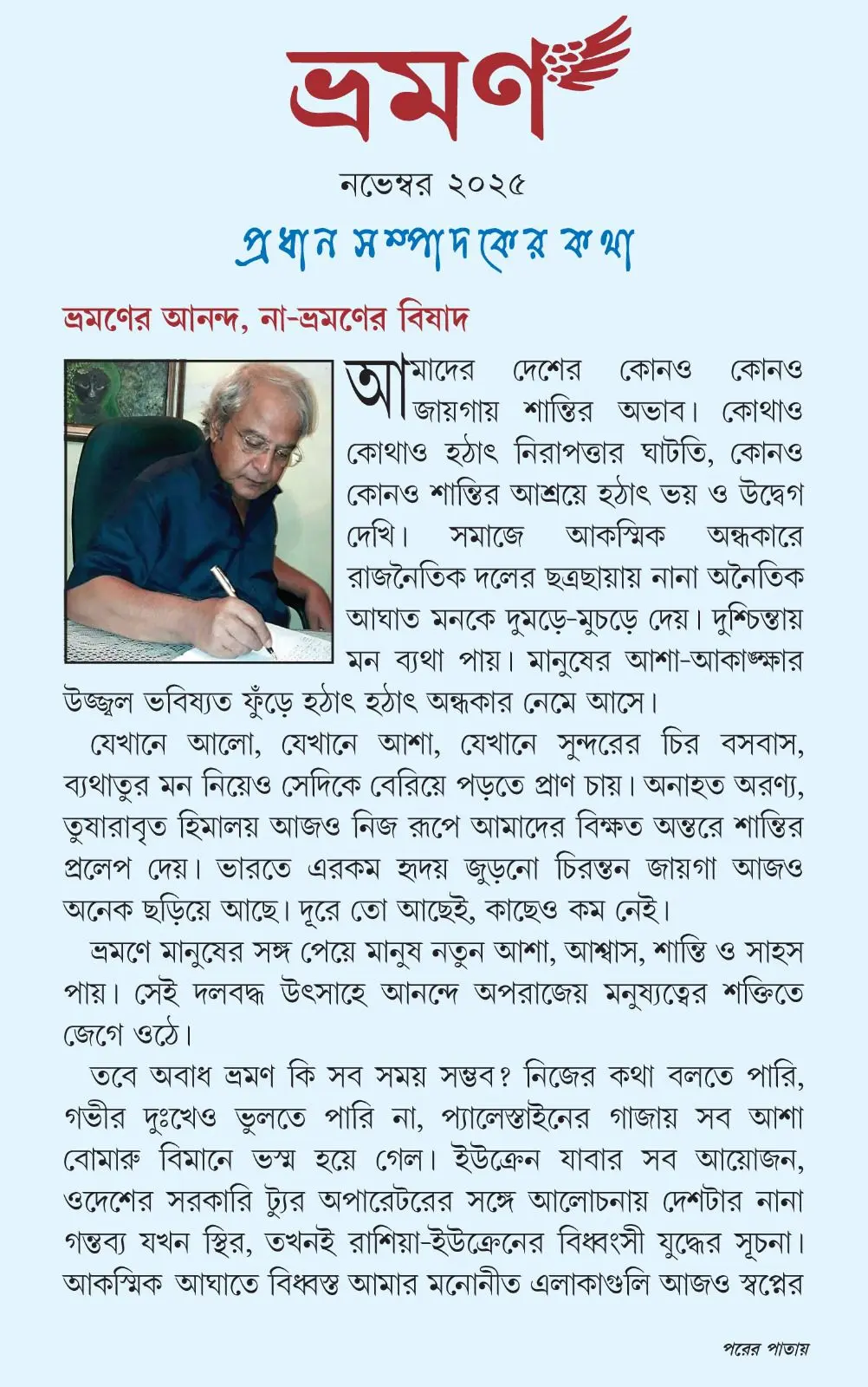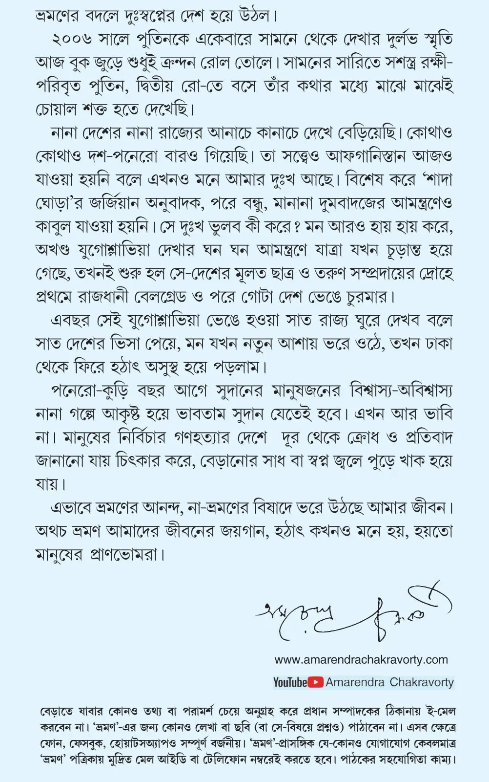 তবে অবাধ ভ্রমণ কি সব সময় সম্ভব? নিজের কথা বলতে পারি, গভীর দুঃখেও ভুলতে পারি না, প্যালেস্তাইনের গাজায় সব আশা বোমারু বিমানে ভস্ম হয়ে গেল। ইউক্রেন যাবার সব আয়োজন, ওদেশের সরকারি ট্যুর অপারেটরের সঙ্গে আলোচনায় দেশটার নানা গন্তব্য যখন স্থির, তখনই রাশিয়া-ইউক্রেনের বিধ্বংসী যুদ্ধের সূচনা। আকস্মিক আঘাতে বিধ্বস্ত আমার মনোনীত এলাকাগুলি আজও স্বপ্নের